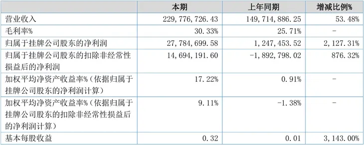 芥末堆文 堆九收到新三板上市公司知音文化发布的2021年半年度报告,财报显示:报告期内,知音文化营业收入为2.30亿元,同比增长53.48%,归属于挂牌公司股东的净利润为2778.47万元,同比增长2127.31%。