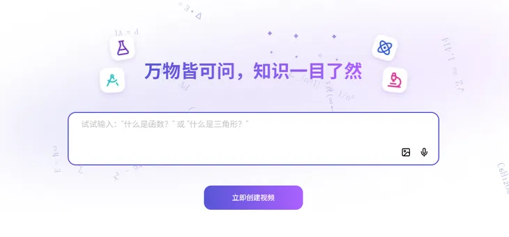 VideoTutor的界面简洁,操作简单。用户只需输入一个问题或一道题目,例如“什么是三角形”或者SAT考试题目,点击“立即创建视频”,AI即可自动生成一段带有生动的配图和动画、清晰步骤、AI配音的讲解视频。在生成时,还会出现倒计时画面,以显示生成速度之快。