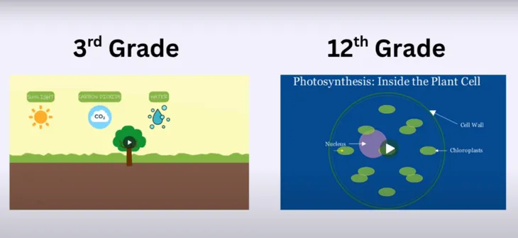 此外,VideoTutor还能针对不同的年级生成对应学习程度的视频。以植物的光合作用为例,为3年级学生讲解时,生成的视频和配音风格适合低年级学生,面向12年级学生的视频配图、讲解用词会更加学术,配音也采用成人音色。