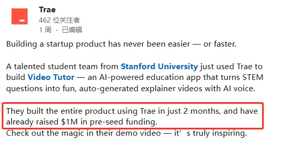 Trae在领英账号分享,VideoTutor的团队在短短2个月内搭建了整个产品,并且已经获得100万美元Pre种子轮融资。Trae也透露,VideoTutor团队使用了Trae来搭建其产品。