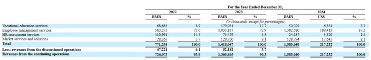 这三年,雇员管理服务在总营收(包含非连续性经营收入)的占比分别为73%、72.9%、87.2%;职业教育服务的占比分别为8.9%、12.7%、3.2%;人力资源招聘服务的占比分别为14.4%、5.3%、1.5%;市场服务及解决方案的占比分别为3.7%、9.1%、8.1%。