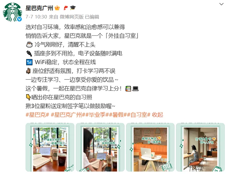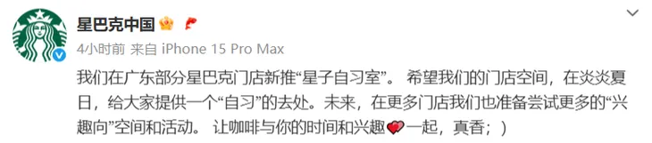 7月22日,“星巴克中国”在微博官方账号回应,“我们在广东部分星巴克门店新推‘星子自习室’。希望我们的门店空间,在炎炎夏日,给大家提供一个‘自习’的去处。未来,在更多门店我们也准备尝试更多的‘兴趣向’空间和活动。”