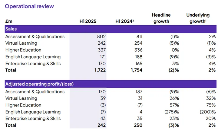 近日,培生(FTSE:PSON.L)公布了未经审计的2025年中期财报。2025年上半年,培生收入17.22亿英镑,同比增长2%;调整后营业利润达2.42亿英镑,较去年同期增长2%。