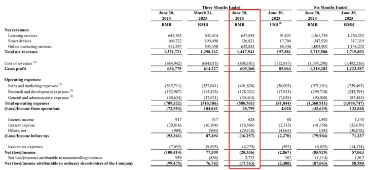 2025年第二季度,有道净收入14.2亿元,同比增长7.2%;毛利润6.09亿元,同比下降4.3%;毛利率43.0%,去年同期为48.2%;经营利润2880万元,去年同期为经营亏损7260万元;净利润为亏损2054万元。