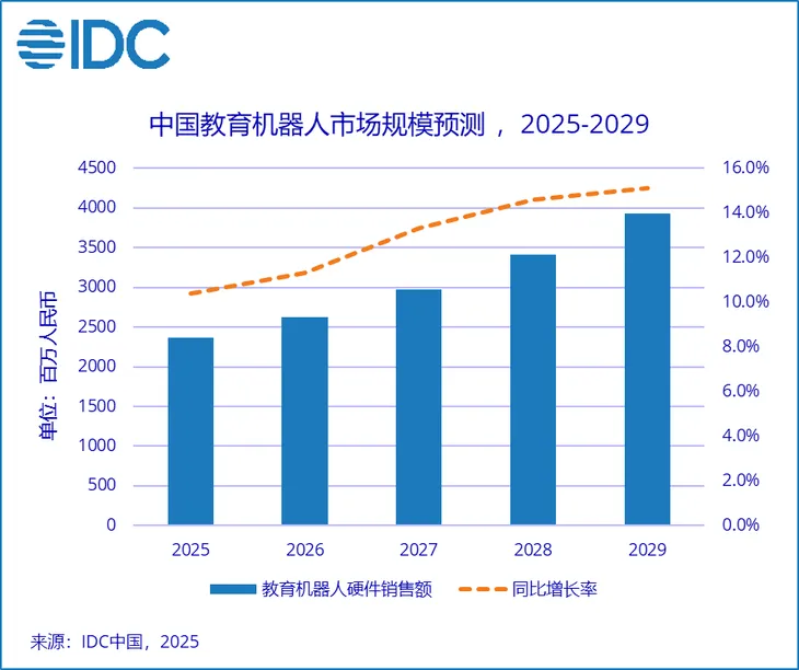 IDC预计,到2029年,中国教育机器人市场硬件销售额将达到39.3亿元人民币,5年复合增长率12.9%。