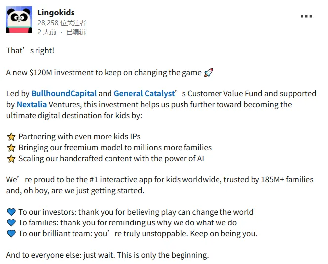 近日,儿童互动学习应用Lingokids宣布获得1.2亿美元新一轮融资。