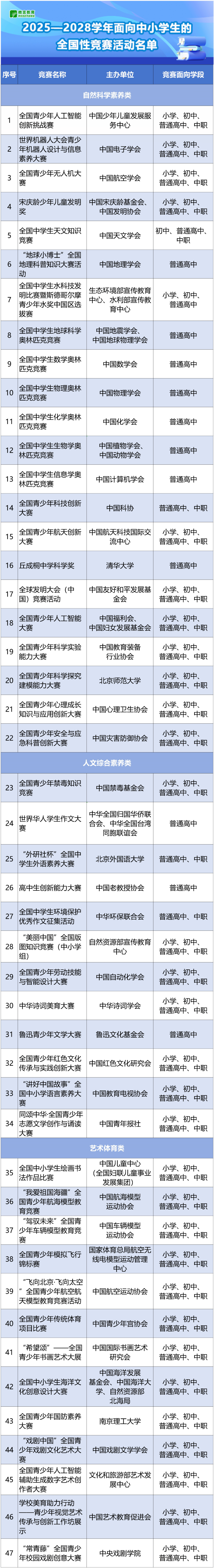 教育部近日印发通知,确定47项竞赛活动为2025—2028学年面向中小学生的全国性竞赛活动。