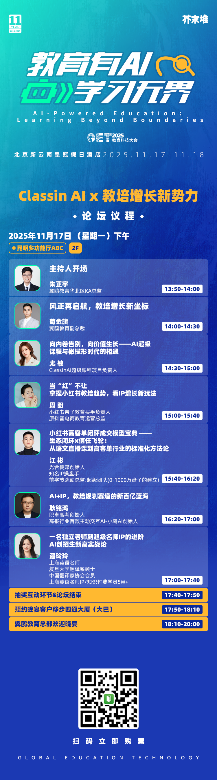 11月17日下午,主题论坛邀请到翼鸥教育副总裁荀金旗、ClassInAI超级课程项目负责人尤敏、小红书亲子教育买手负责人周盼、光合传媒创始人江彬、职卓高考创始人耿铭鸿、上海英语名师潘玲玲,他们将围绕教培增长、AI超级课程、小红书教培趋势与IP增长、高客单闭环成交模型、用AI+IP逆袭、打造名师IP等主题,进行分享。