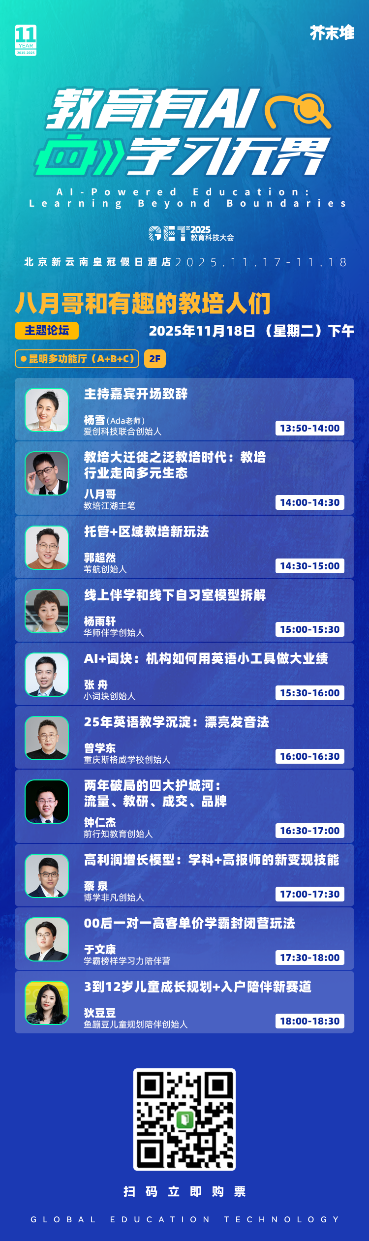 ——以上这些嘉宾所从事的,已经覆盖了“托管、教培、自习室、伴学、规划、工具、入户、集训营”等赛道,这些拿到结果,也乐于分享的朋友们,即将在11月18号下午的GET分论坛,为大家倾情呈现。