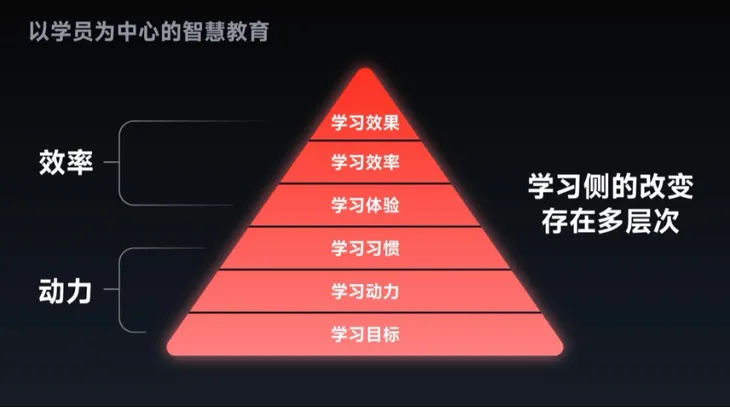 我们看似要的是塔尖上的“学习效果”,这就像“五个馒头”的理论,吃到第五个馒头才饱,不代表前四个没有价值。要解决学习效果问题,必须把底下的几层做好:学习效率、学习体验、学习习惯、学习动力和学习目标。