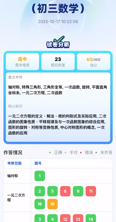 3.【“真人级”AI诊断与讲解】 在AI答疑讲解方面,我们追求“真人级”水平。比如学生上传手写数学试卷后,AI能进行完整诊断,生成一份非常详细的报告,包括错题归因、知识点分析、能力图谱和个性化学习计划等,效果很完整,几乎接近线下一对一名师辅导的效果。另外不同于拍搜工具只给标准答案,我们通过多模态能力,将板书、语音和动态演示完美结合(比如画几何辅助线),让理解能力偏弱的学生也能听懂,效果远胜简单拍搜。