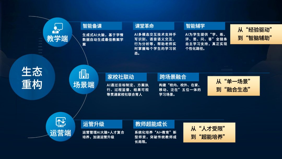 其次,在场景端,家校社联动,比如“社会需要什么样的人才”这样一个目标,怎么样跟家庭、学校的教育融合,育人的方案怎么去执行,育人过程怎么去监督,结果是不是真正可见,这些通过AI的能力加持,现在逐步可以做到贯通家校社联合育人。不同的学习场景,如校内、校外、在家、移动、泛在,在AI时代已经开始被融合,我们讲场景端已经从“单一场景”变成“融合生态”。