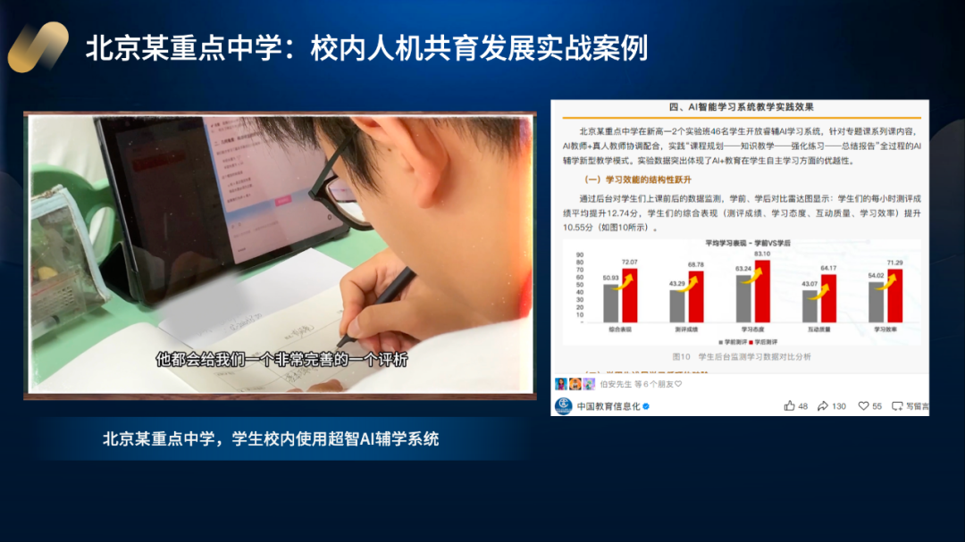 我可能是一个比较笨拙的创业者,永远抄不了近路,我从整个模型训练到应用开发过程中,干了非常多脏活、苦活、累活,每一个功能都带着团队去冲刺、尝试,一直到把产品做出来,目前我们的产品已经进到学校当中,这是我们在北京朝阳名校——北京中学的案例场景。