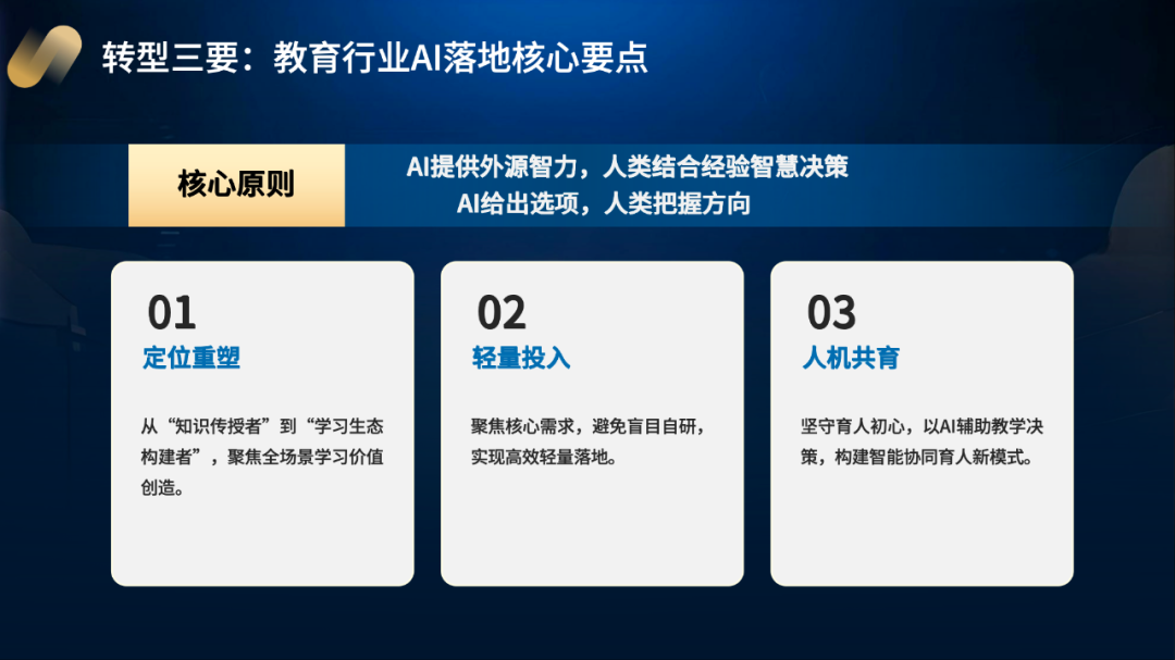 其次,效率与价值变了,过去互联网这么多年一直想提升教育行业的很多效率,但是跟过去传统互联网时代不一样,AI是从根上彻底的把这种效率大幅度的提升了,过去老师需要花大量时间做很多重复的、机械的工作,比如批改作业、备课、对学生进行试卷分析,今天可以把这些时间快速的降到很低的水平,甚至降为零,这样的一种效率革命可想而知;同时价值发生了跃迁,老师的价值发生了变化,老师的价值从一个知识传授者开始变成学习的组织者,学习价值的传递者,要去启发学生,要给学生情感链接,要去训练孩子的思维,要去培养孩子终身学习力,这变成了老师新的价值。当然这些东西过去也有,只不过今天变得更为突出,教学效率和价值都在经历从“重复劳动”到“价值创造”的变化。