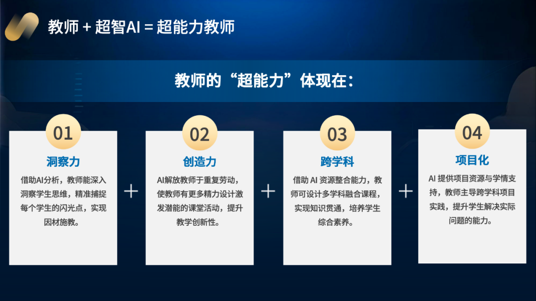 老师+超智AI,就变成了超能力教师。在洞察力方面,AI能帮老师深入分析学生思维,精准捕捉每个孩子的闪光点,实现“因材施教”;创造力方面,AI解放老师重复劳动,让老师有更多精力设计激发潜能的课堂活动,教学创新性直接拉满;跨学科方面,AI整合资源后,老师能设计多学科融合课程,知识贯通、学生综合素养也跟着涨;最后项目化方面,AI提供项目资源与学情支持,老师主导学科项目实践,学生解决实际问题的能力快速提升。