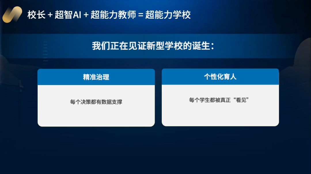 而校长 + 超智AI + 超能力教师,将催生出“超能力学校”这一新型教育形态,这种新型学校以“精准治理”保障决策科学性,以“个性化育人”实现学生发展针对性,让每个学生都被真正“看见”。