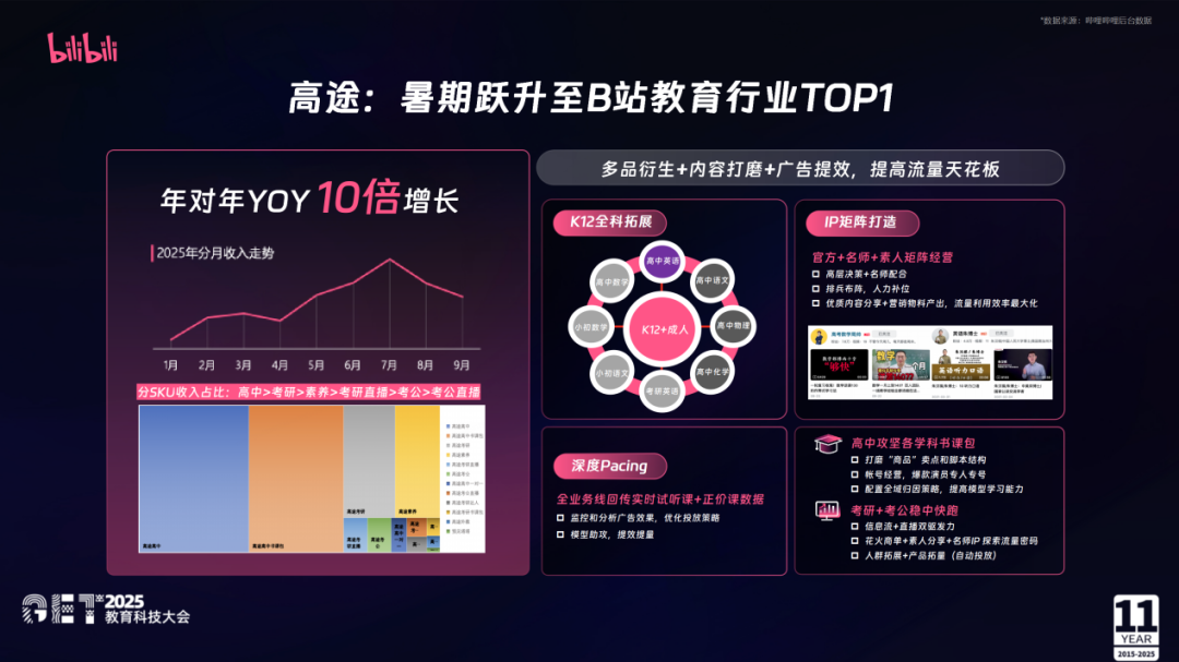 最终,高途的广告GMV在一年内实现10倍增长,暑期更是跃升至B站教育行业第一。这是一个足够清晰的信号:在B站,“内容驱动 + 数据优化”的组合正在成为教育机构的共同方向。