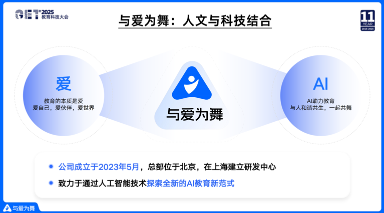第二,爱是AI的谐音,我们希望AI能够协助教育,同时也希望我们是一个人文跟科技结合的公司。公司在2023年5月份成立,现在已经在北京和上海有研发中心,我们希望通过AI技术探索出一些教育的新范式,这就是我们公司成立的背景。