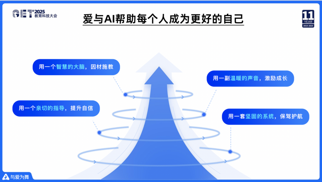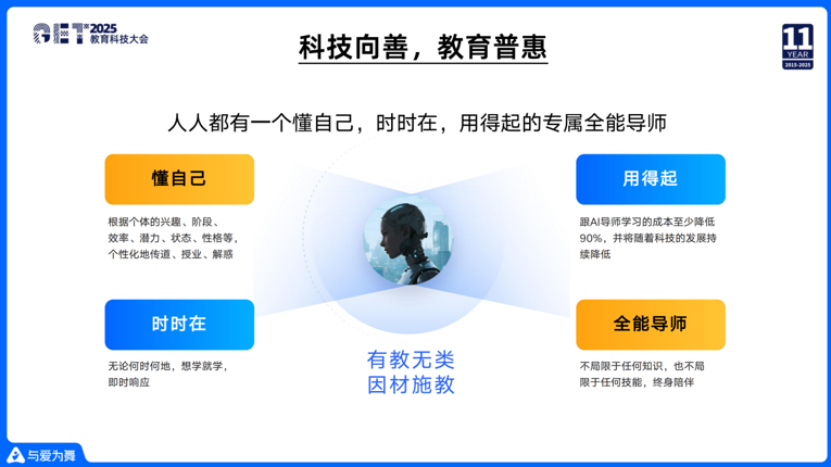 我们成立的初心是希望人人都有一个适合自己的AI老师。这个AI老师能够去了解每一个学生的兴趣,根据每一个学生的优点和不足因材施教,可以24小时在线、即时响应。此外,我们希望AI老师能够让千家万户更多孩子用到,他的成本比现在一对一的成本降低一个数量级甚至更多。最后我们希望这个老师不仅传授知识,更重要的是全方位的帮助学生,做到终身陪伴。这就是我们创业的初心。