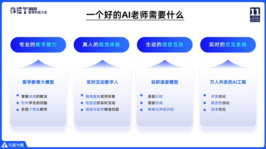 11月17日至18日,芥末堆在北京举办以“教育有AI,学习无界”为主题的GET2025教育科技大会。与爱为舞联合创始人王琳就《从单向输出,到万人互动—“爱学”的AI落地实践》进行了主题分享。这是与爱为舞成立两年多以来,第一次在GET大会上正式亮相,因此这次分享也吸引了业内很多从业者和媒体的关注。王琳通过拆解一个好的AI老师所需要的必要条件,对与爱为舞的产品以及大模型、数字人、语音等技术进展做了介绍,同时也分享了在AI应用的创业过程中的一些底层思考。