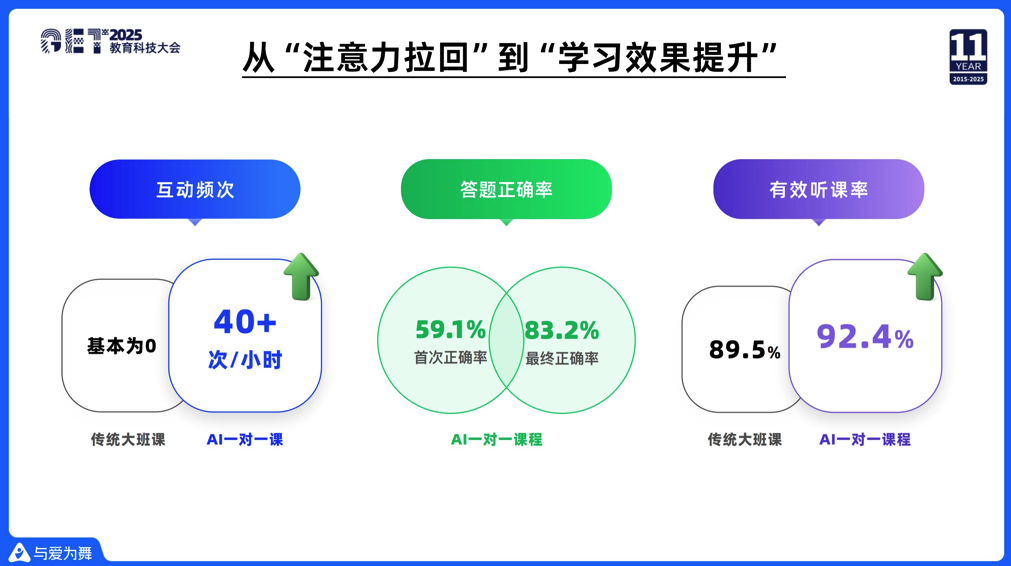 从数据中可以看到,当老师第一次问学生问题的时候,有59%的学生可以答对,当他一步一步引导,跟学生多轮交流后,最终可以达到83%的准确率。这24%的准确率的提升,就是AI一对一的互动带来的。除了准确率,我们的有效听课率也得到了相应提升。
