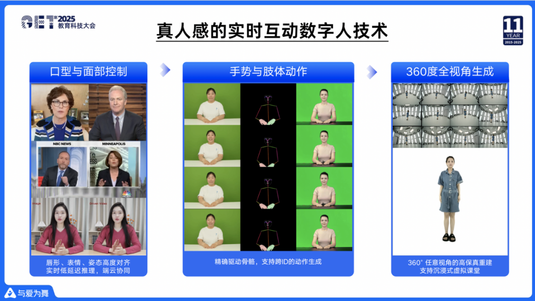 第一是老师可能不太方便拍摄,第二是老师在几个月后或者半年后,即使想拍摄,他的形象和状态,跟几个月前也不一样,同一个人即使一周后和一周前的拍摄状态都不一样,这种情况就无法生成一模一样的数字人。因此我们创新性的做了跨ID的动作生成,用第三方来做动作,通过骨骼重定向的方向来驱使原来的数字人,就可以给原来的数字人加一些新的动作。有了肢体动作之后,我们下一步希望做到360度沉浸的数字人,希望在未来课堂上的老师,真的能够走出三分屏,走到学生面前,实现一个沉浸式的互动。