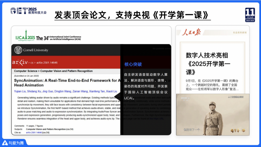 今年我们也把一些核心的技术进行了公开发表,在全球AI顶会IJCAI上发表语音驱动的数字人论文,同时在今年的9月1日跟央视合作,把左权将军照片复原,并做出一个敬礼的动作。