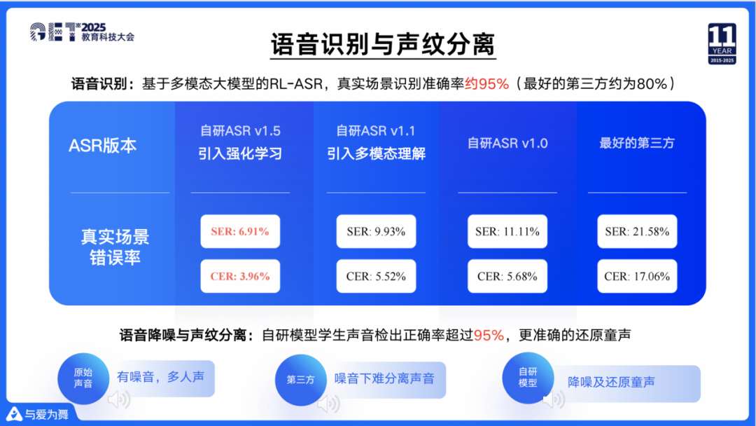 这意味着什么呢?当学生说100个句子,有20句是错误的,这是不可接受的。因此我们把多模态理解引入到ASR模型中,同时加入了强化学习,让模型可以持续做自我进化。最终我们在真实场景中,把语音识别的准确率,从80%多提升到95%,这样学生会得到比较好的体验。