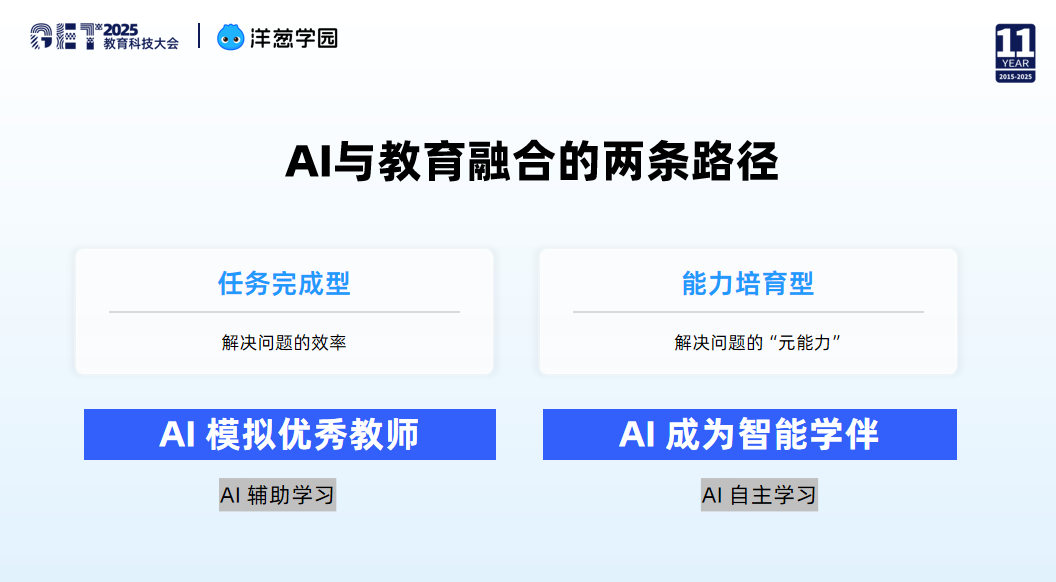 第一条是“提效型”:用AI帮学生更快完成作业、答题、背诵,把学习任务当成“打车”、“点外卖”一样高效交付;第二条是“育能型”:在解决问题的过程中,真正培养学生的底层能力,让他下次能自己解决类似问题。