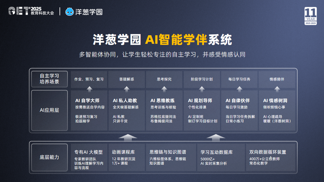 过去12年,我们一直朝着这个方向努力。大模型技术的成熟,让我们看到了更清晰的实现路径。我们构建了洋葱学园特有的智能体系统,其核心目标,正是系统化培育学生的自主学习能力。