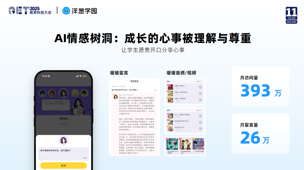 目前,我们每月收到几十万条学生的心理倾诉。从反馈来看,这一功能切实帮助了许多学生:有人感到豁然开朗,有人学会了如何处理人际关系,也有家长反馈与孩子关系改善,实现了亲子关系的和解。