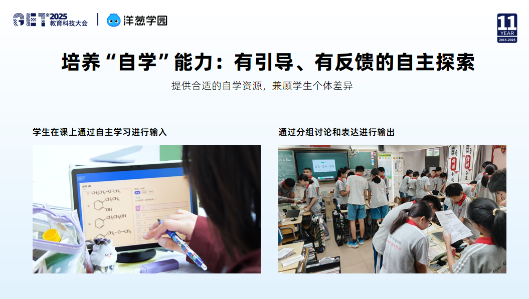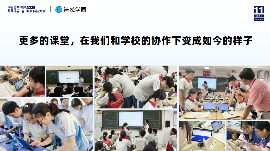 我们为学校提供全方位的支持,目标就是帮助学校构建“先学后教”的课堂模式。通过智能终端、洋葱资源与各类智能体应用,我们助力合作学校实现课堂结构的转型:超过50%的时间由学生主导,学生先自主学习,再开展小组合作、互助表达、上台展示,教师则专注于关键点评与总结升华。