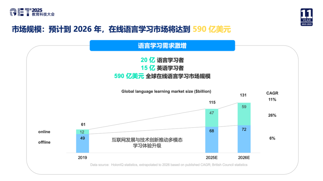 全球语言学习市场正在进入新的增长周期。全球共有 20 亿语言学习者,其中 15 亿正在学英语。随着学习方式的线上化,全球在线语言学习市场从 2019 年的 120 亿美元,预计将在 2026 年达到 590 亿美元,并继续向千亿美元规模扩张。线下向线上迁移的速度极快,CAGR 达到 26%。这是一个增量巨大、结构正在重塑的全球市场,也意味着新的学习体验与新一代产品形态都有机会重新占据用户心智。这种增长背后的根本驱动力,是整体语言需求因全球流动与职场竞争而持续上升,而在线部分又因数字化习惯的形成与口语训练可规模化而增长得更快。