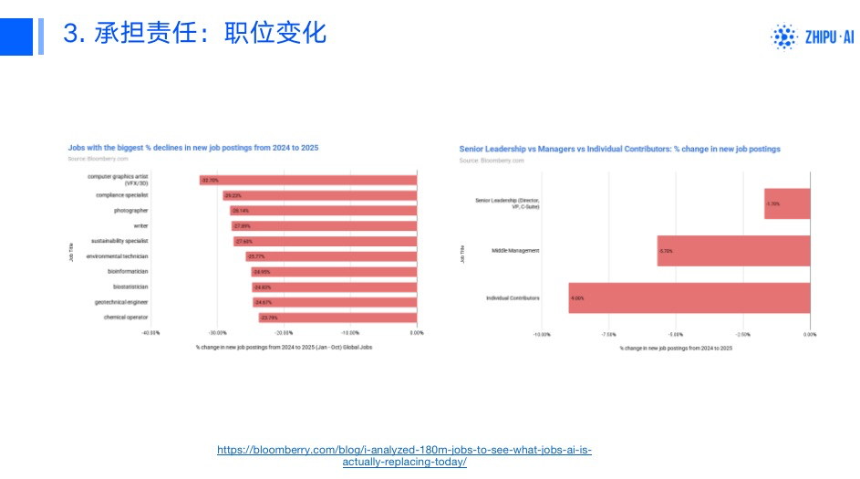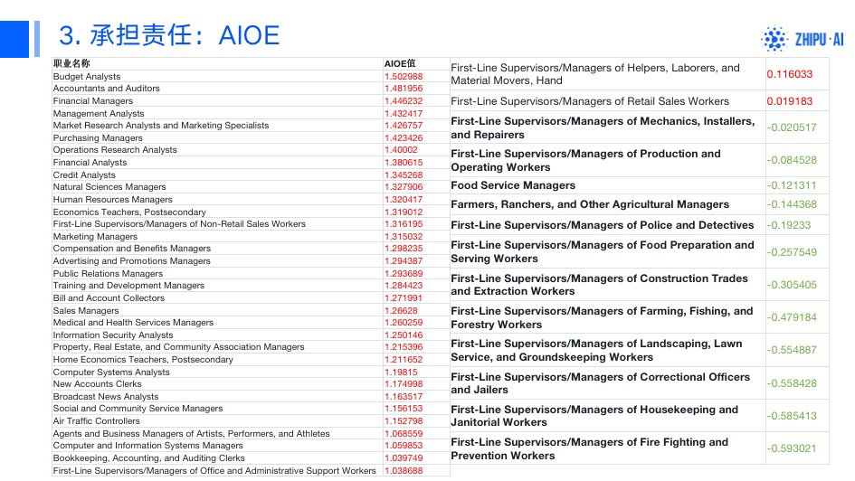 这是2023年的数据,最底下的一排是电话销售员、文科老师。我估计,统计2024年数据的话,理工科老师分数也会提高。因为推理模型越来越强。这是我基于上述数据分析的结果。请大家看分数比较低的职业,都是监管或者管理岗位。这些岗位说好听的是管理者,说不好听的就是个背锅的,是要承担责任的。