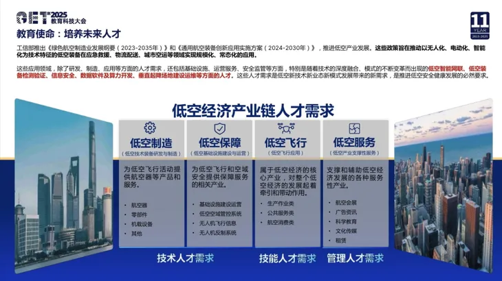我不是技术专家,不懂空气动力学,不懂飞机的造型结构和飞行系统,但这并不妨碍我们切入低空经济。为什么?因为在政策推动下,这一行业存在巨大的人才缺口,而教育行业与低空经济存在非常多的交集。