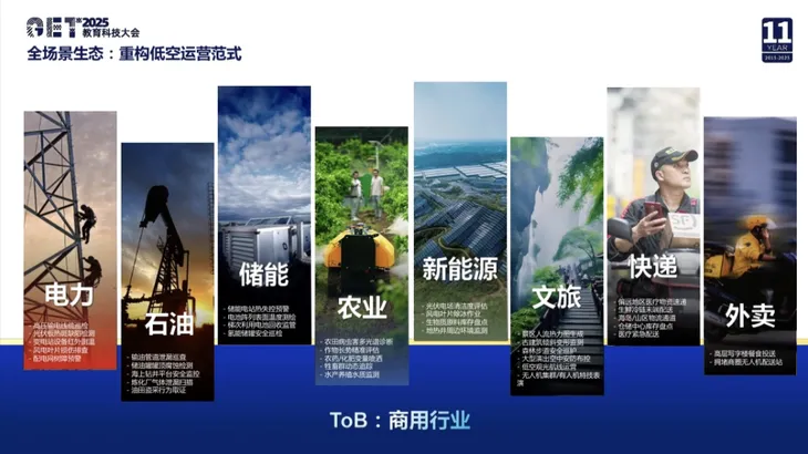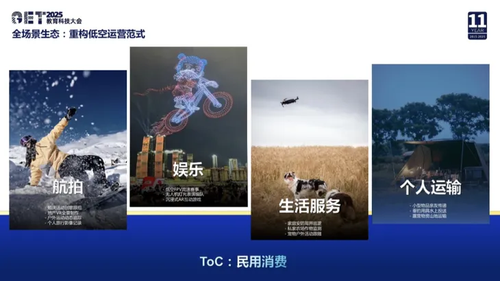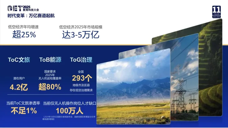 那么,低空经济和教育有什么关系?很多人一听到低空经济,第一反应就是无人机。但实际上,这一概念的应用已经拓展到了20多个行业、180多个场景。政策在驱动,市场急需,即使是无人机飞手,也存在100万人的人才缺口。这让我想起十年前的在线教育,那时也是一个政策与市场双重驱动下,充满机遇和潜力的时代。