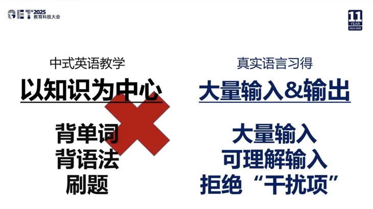 今天的主流英语教育仍然以知识点为中心:大量背单词、背语法、刷题。甚至去教培班上课最后还是在讲题、刷题。这在2025年AI席卷世界的时代,显得有些可悲。