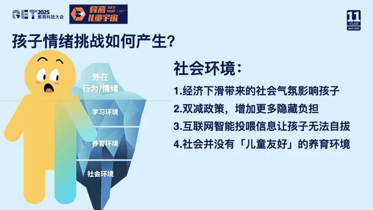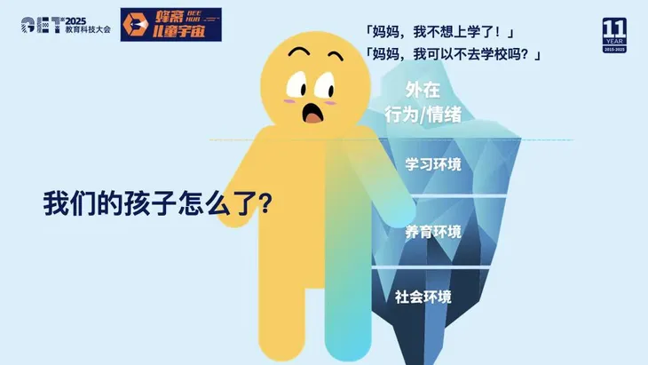 我们听到越来越多孩子说:“妈妈,我不想上学了。”“妈妈,我今天能不去学校吗?”小红书上,有很多人在讨论“我的孩子厌学了怎么办”。问题到底是什么?孩子的情绪挑战已经普遍存在,影响到了学业。我们总是从高处去讨论孩子需要变革。AI可以帮他学习,但我想从孩子的视角看:当他说“妈妈,我不想上学”,这只是冰山一角,他的行为只是表层现象。