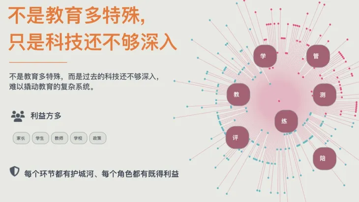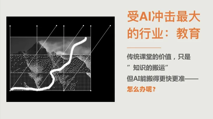 AI冲击下,教育行业遭遇的变化最大。过去,传统课堂的核心模式是将老师脑中的知识“转移”到学生的大脑,再通过试卷考核学生的掌握程度。然而,今天,AI能够以更快、更好的方式实现这一切。那我们应该怎么做呢?我的想法是:直接颠覆现有模式。