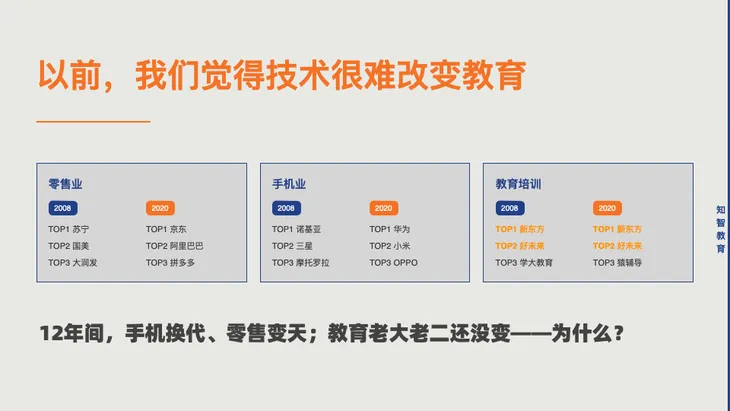 那么,为什么我相信AI教育的“苹果时刻”必然会到来?回顾2008到2020年的历史,几乎所有行业都经历了翻天覆地的变化:手机换代,零售发生巨变,然而教育行业的“老大老二”依然未变。为什么?难道教育如此特殊?在我看来,这一切的背后只是一个成本问题。无论是音视频技术,还是算法,这些看似神奇的技术,过去都需要巨大的投入。尤其在教育这个复杂的系统中,环节多、角色多、利益关系复杂,这让很多人望而却步。