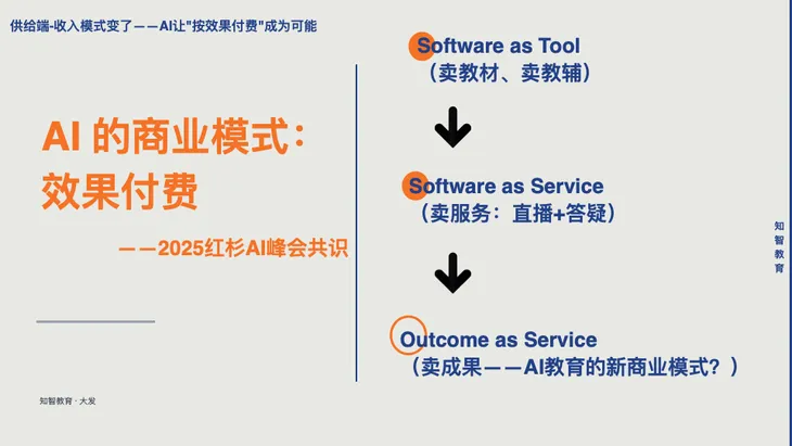 再来看供给端。今年在美国红杉资本2025年AI峰会上,有一个共识:AI的商业模式是“效果付费”。我们把这个概念套用到教育行业,过去我们最早是通过卖教材、教辅来盈利,接着是卖服务,像双师大班课,主要通过直播和答疑来交付服务。如果说“效果付费”是AI商业模式的核心,那么,AI教育的“苹果时刻”会是什么样子呢?我们要具体去探讨这个问题。
