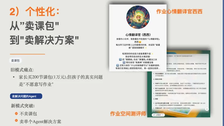 通过AI的引入,我们的产品开发周期和教研周期加速了百倍。而在个性化教育方面,我们过去在帮助家长解决孩子不写作业的问题时,发现本质的症结并不是“课程不够”,而是孩子不愿意写作业。家长们心里也清楚,孩子在什么成绩区间,作业质量如何。如今,解决这个问题的方式并不是卖更多的课包。