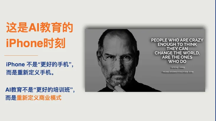 我今天想分享一个思考:我们完全有机会不只是“哥伦布”,而是“乔布斯”。刚才我们聊了AI教育的技术、教学方法,还有出海的愿景。接下来,我希望能更深刻地探讨一下,AI教育如何重构底层的商业模式。