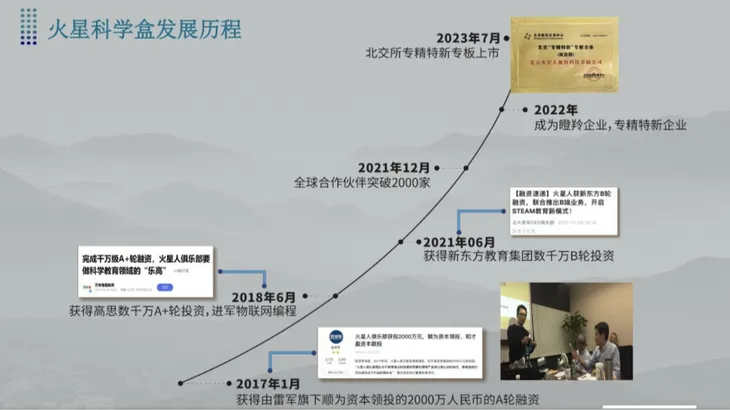 这就是我们一路走下来的发展轨迹:我在北大读书的时候拿到第一笔投资,也拿到了华为的 offer,说实话,就是这一步把我的职业前景耽误了,让我义无反顾地跳进了一个“前景不太好的行业”。后来,新东方、高思也都投了我们;最近我们在北美做了一点业务,卖了一些盒子。