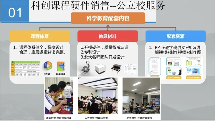 基于现行政策,我们的主营业务几乎都围绕“课后三点半”展开。在“双减”之后,各地公办学校开设更丰富的特色课程。在实际执行中,每一所学校都会面临科学课程内容、材料包、配套实验、双师课等多方面的需求。这也是为什么,我们能敲开超过一万一千所学校的门:这些学校正在使用我们提供的课程内容、硬件材料与教学服务。