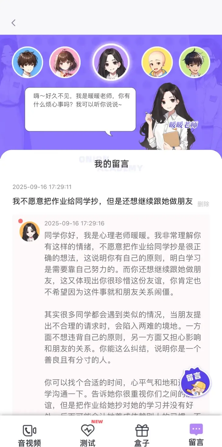 AI情感陪伴即“洋葱树洞”,则通过自然语言理解与情感识别技术,实时感知学生孤独、挫败、焦虑等情绪并给予温暖回应,近一个月访问量达393万次、留言26万条,展现出了AI心理支持渗透力及情感陪伴对自主学习生态的必要性:让学习更高效且有温度。