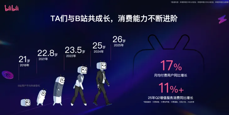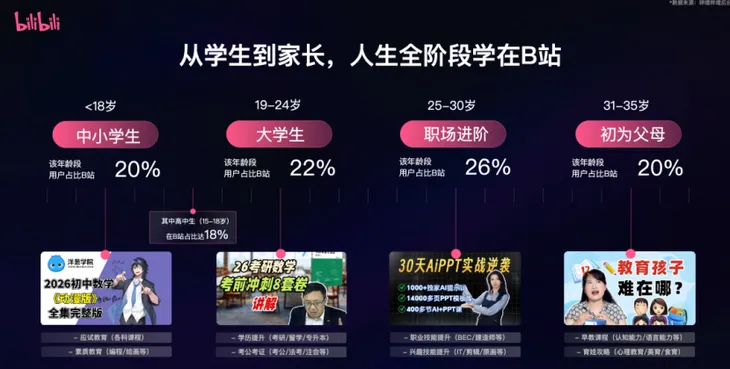 用户基础的扎实与多元,为B站教育生态奠定了坚实根基。官方数据显示,中国近七成90后(含00后)活跃于B站;从2018年到2025年,用户平均年龄从21岁升至26岁,人生阶段不断升级。