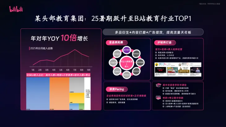 某头部教育集团在2025年将B站视为战略重点,采取“单点切入-模型跑通-全品类延伸”的策略,在站稳高中学段后,逐步拓展至考研、考公等多个SKU。