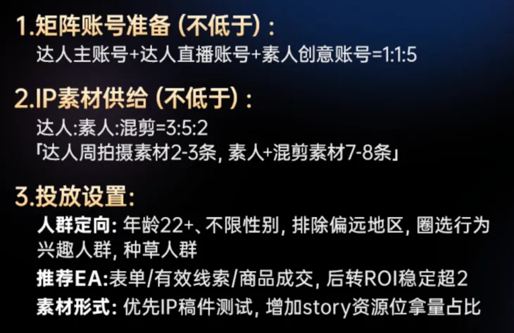 合作模式上机构可以根据自身需求,选择“GMV分成”或“广告投放代运营”两种,同时配套标准化的全链路营销路径,帮助机构实现从获客到转化的流程化落地。在投放实操方面,也提供了广告主矩阵账号和投放端的执行建议。
