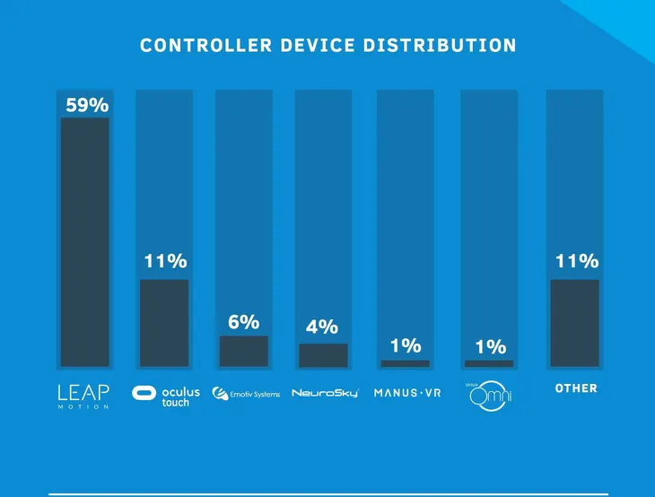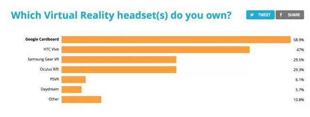 拥有 VR 设备的人中,58.9% 的受访者使用 Google Cardboard,47% 的人选择 HTC Vive;使用 Oculus Rift 和 The Samsung Gear VR 的人数非常接近,分别是 29.3% 和 29.5%。